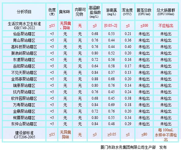 2024年8月厦门市政水务给水水质公告