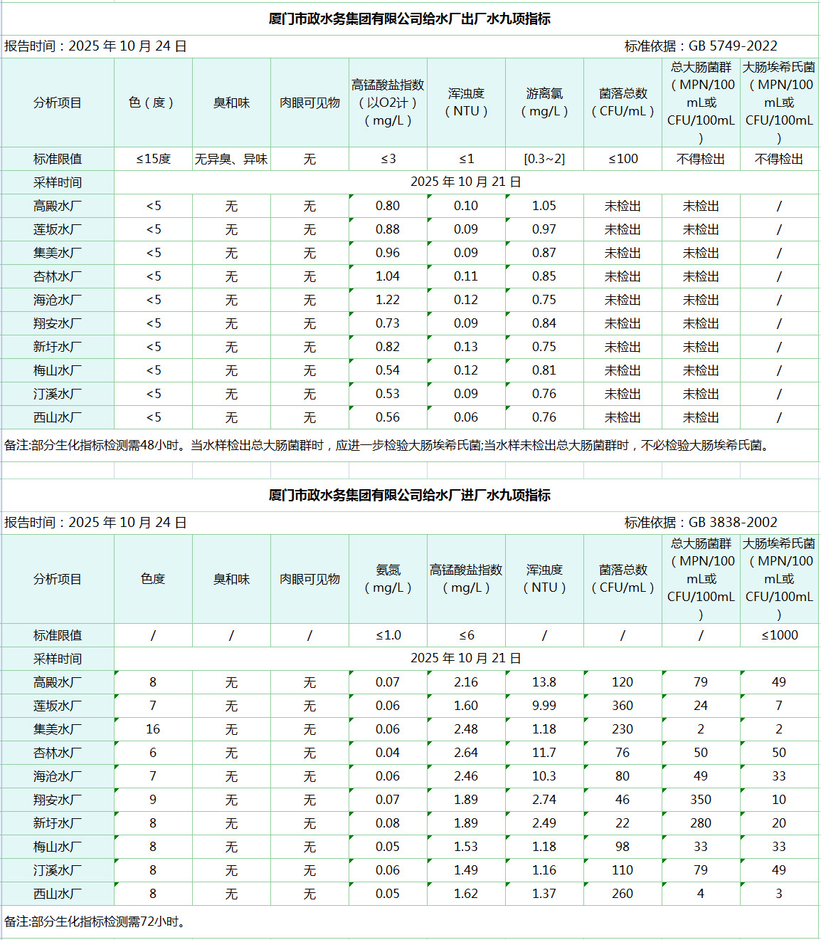 2025年10月21日海角视频 给水水厂水质信息公布