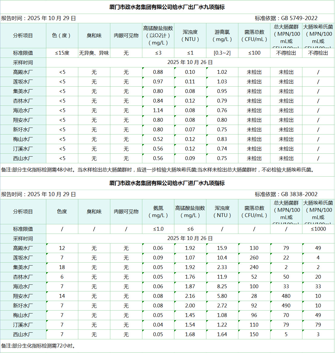 2025年10月26日海角视频 给水水厂水质信息公布