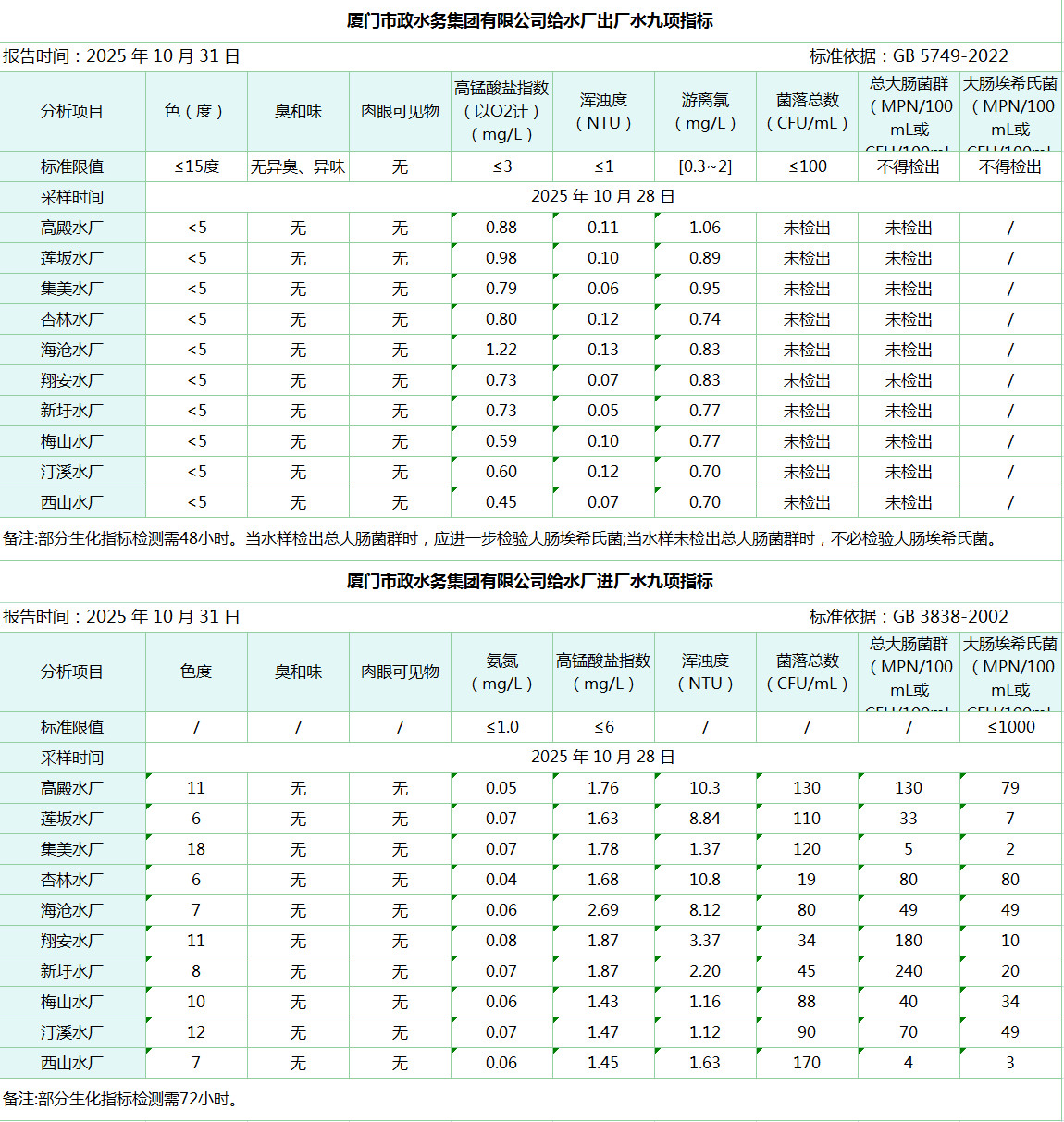 2025年10月28日海角视频 给水水厂水质信息公布