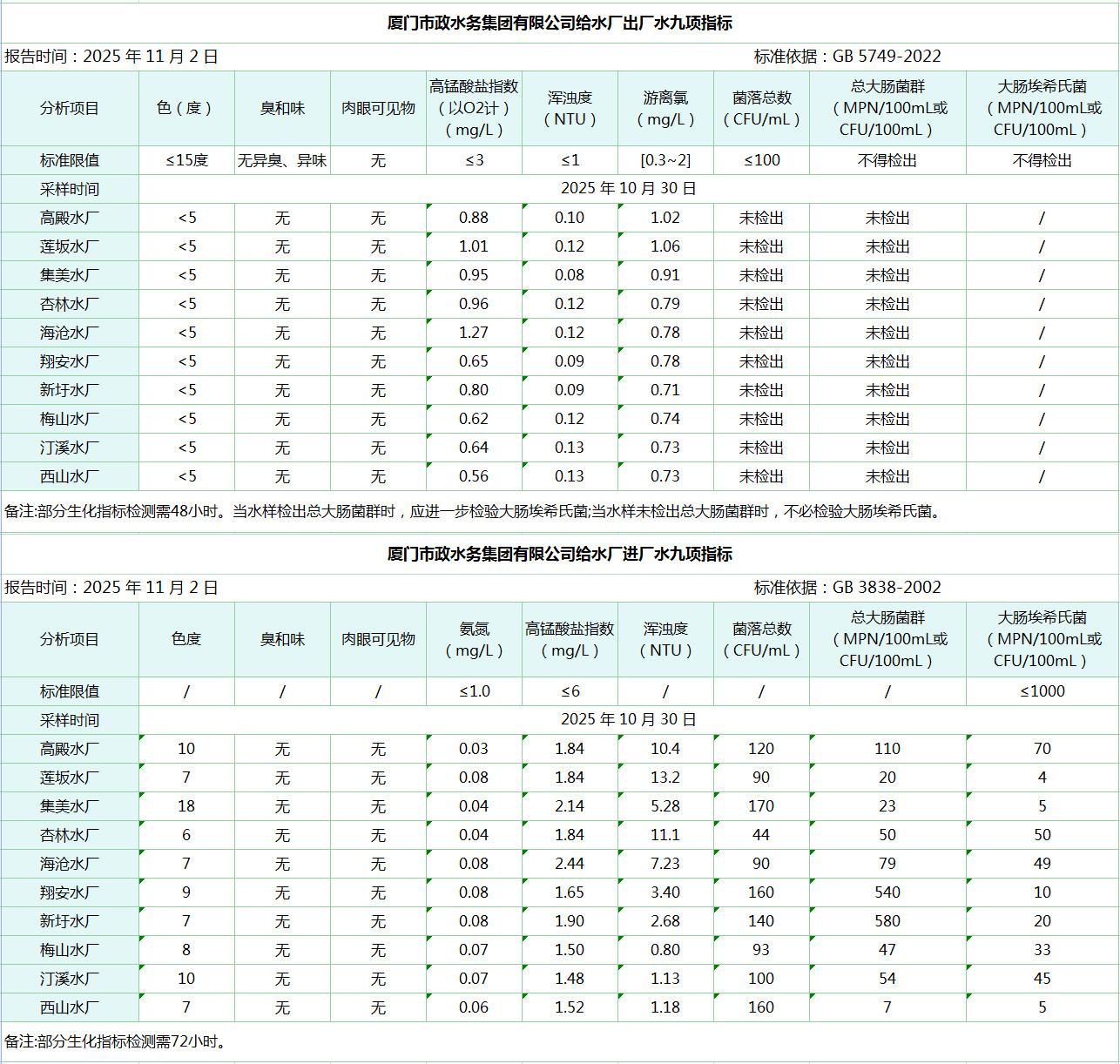 2025年10月30日海角视频 给水水厂水质信息公布
