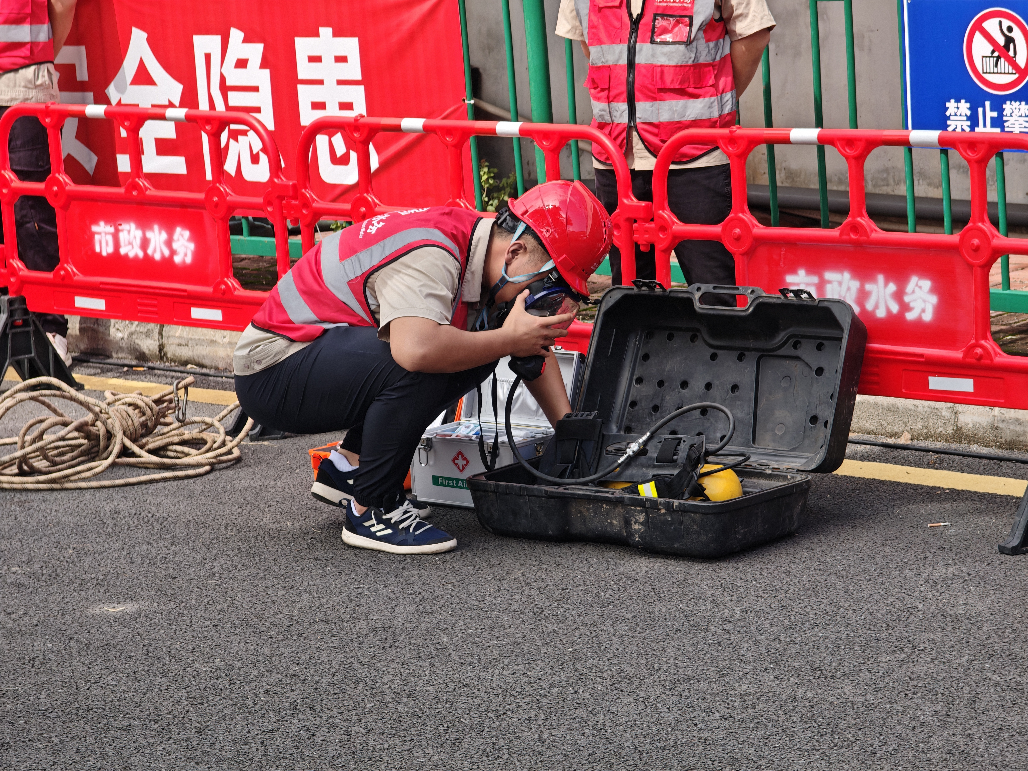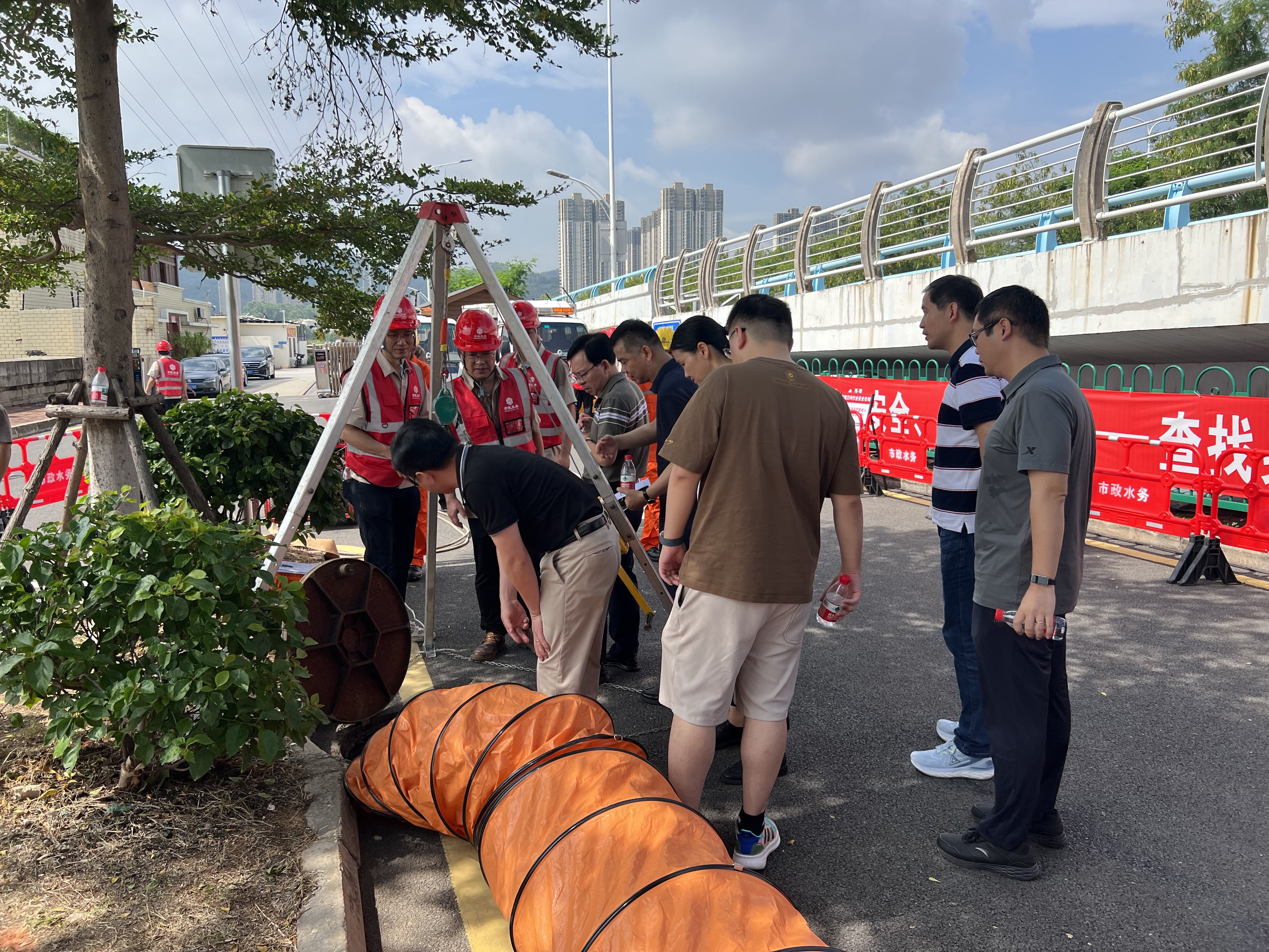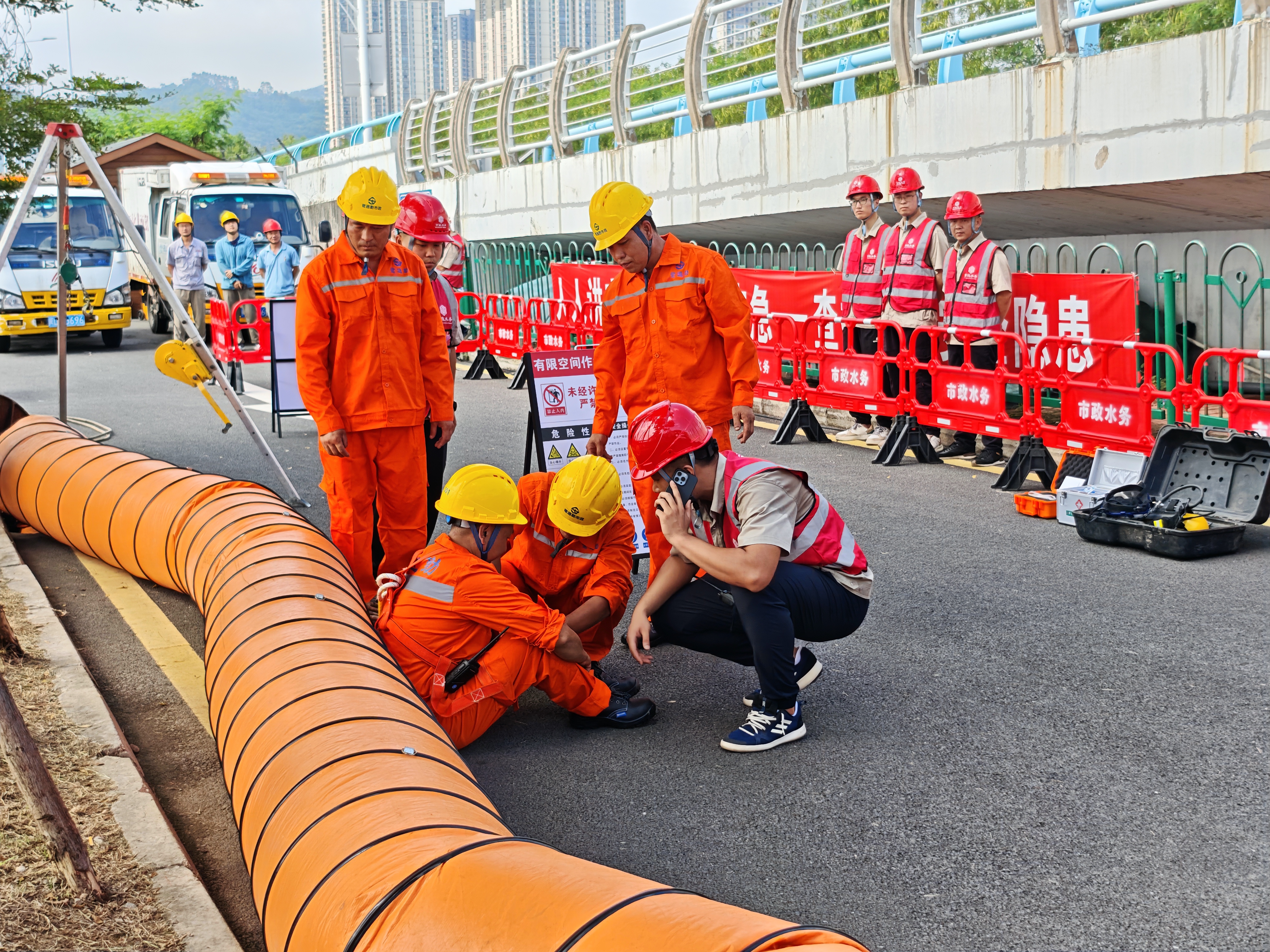 上午9时许,演练正式启动,随着现场总指挥一声令下,严阵以待的各部人员按照“先通风、再检测、后作业”等安全作业原则迅速行动,有序开展有限空间作业、现场应急处置,完整呈现了“日常管网巡查——有限空间作业——突发险情应急”等演练程序,展现了扎实的标准化作业以及科学应急救援技能。